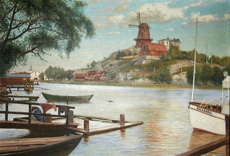 På denna gamla målning av Hammarby Sjö, sedd från södersidan, ser man hur klippan tedde sig i 1900-talets begynnelse. Målningen finns i Erstagårdens stora sal.