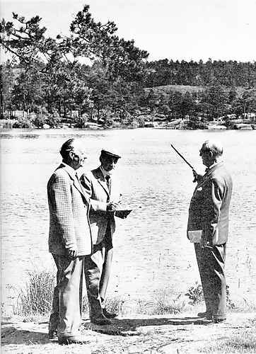 Gamle länssman Knut Jeansson pekar, den 17 juli 1962 stående på berget vid Källtorpssjöns södra strand, ut var Doris kropp hittades dold mellan Stengärdet och sjön. Mannen i rutig kavaj är protokollföraren vi obduktionen, Sven Wadenius