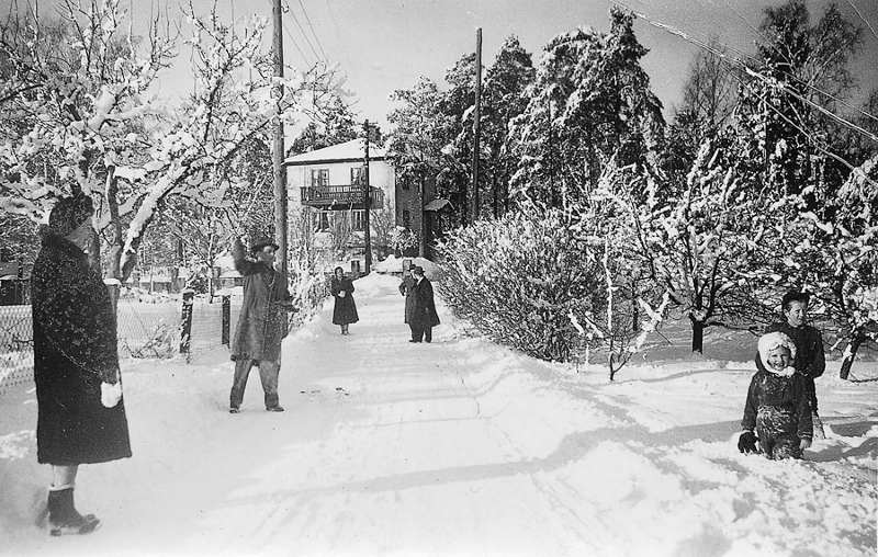 Året är 1949 och, som alltid på den tiden, är det gott om snö. Ofta nog blev det elavbrott på vintern på grund av att ledningarna blev nedtyngda av snö och kortslöts. Då fick man ta fram primuskök och stearinljus. Det tyckte vi barn var extra mysigt, med levande ljus och suset från primusköket då mamma försökte få ihop något ätbart. Något problem med uppvärmning var det dock aldrig, eftersom alla eldade med ved eller koks och värmesystemen var uppbyggda för självcirkulation. Vilka personerna på bilden är har vi inte lyckats identifiera, men huset i bakgrunden är Smedjevägen 21.