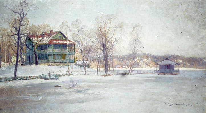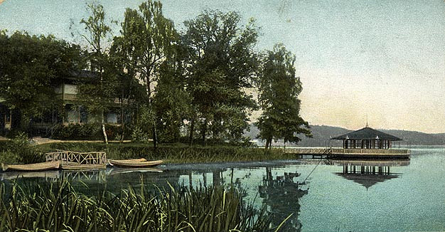 Foto av Nackanäs värdshus från runt sekelskiftet 18-1900. I den lilla paviljongen ute i sjön hölls alltid en festlig kräftpremiär med lyktor och alla tillbehör. Nedan en målning av värdshuset i vinterskrud.