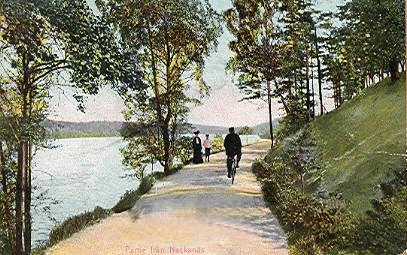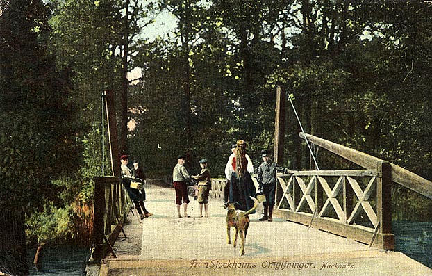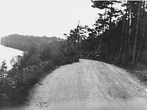 På bilden ses en bit av den smala gamla vägen från Nynäs vid Nackanäsbron i riktning mot Nacka kvarn och Hästhagen.