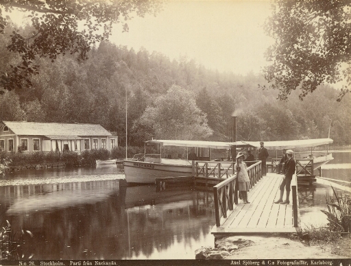 Här har Nackanäs brygga har just angjorts av ångslupen Nackanäs som fraktade gäster från Södermalm ut till värdshuset. Till vänster, på motsatt strand syns Lilla Nynäs som ligger bakom Stora Nynäs utmed gångvägen till Lilla Sickla gård.