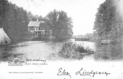 Vykort från Nackanäs 1902. Kortet är taget från Järlasjösidan. Man ser den gamla bron med huset Stora Nynäs på vänstra stranden. Till höger ser man värdshusets brygga.
