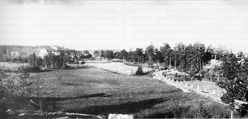 Vy från öster. Ungefär från kullen nuvarande Smedjevägen 28. T.v. skymtar trädgårdsmästarbostaden, Hästhagsvägen 11.