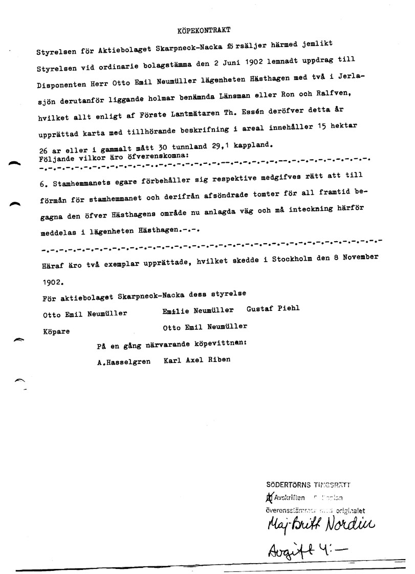 Här nedan finns en avskrift av köpekontraktet för Hästhagen. Den har tillhandahållits av Inga-Lill Stolpe (f. Högberg) på Östervägen 3. Inga-Lill är barnfödd och uppvuxen i Hästhagen. Hennes föräldrar tillhörde de allra första inbyggarna och deras hus stod klart för inflyttning redan 1926.