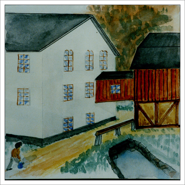 Målning som visar hur sädesmagasinet var anslutet till själva kvarnbyggnaden.