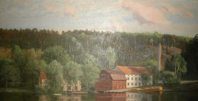 Nacka Kvarn med sädesmagasin och den gamla kvarngården till vänster. Målning i Erstagårdens stora sal.